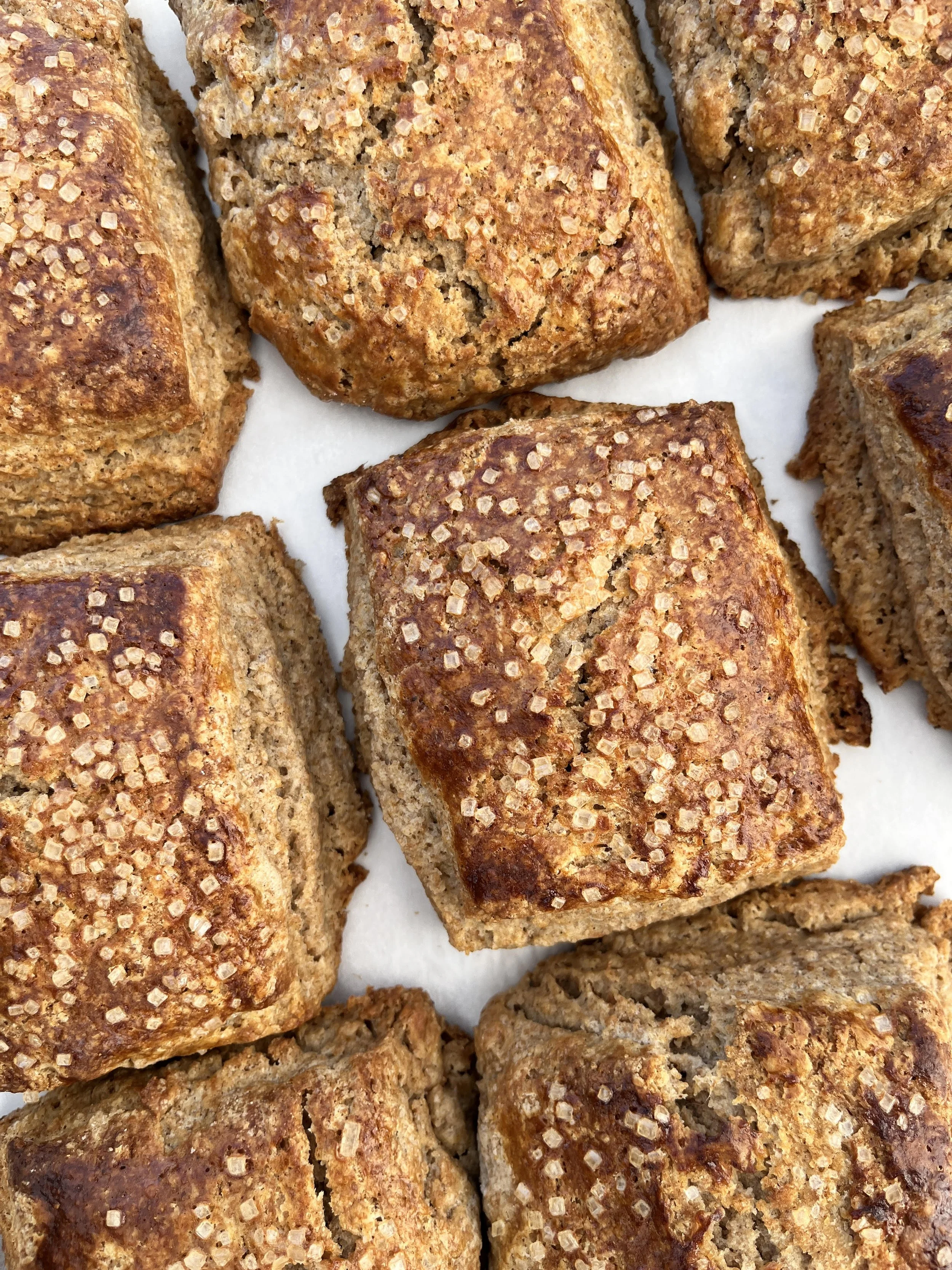 Ingredients: unsalted butter, whole grain spelt flour, organic unbleached flour, whole grain sourdough starter {whole wheat flour, rye flour, water}, organic cane sugar, buttermilk, eggs, Bartlett pears, baking powder, organic chai spice blend, fine sea salt